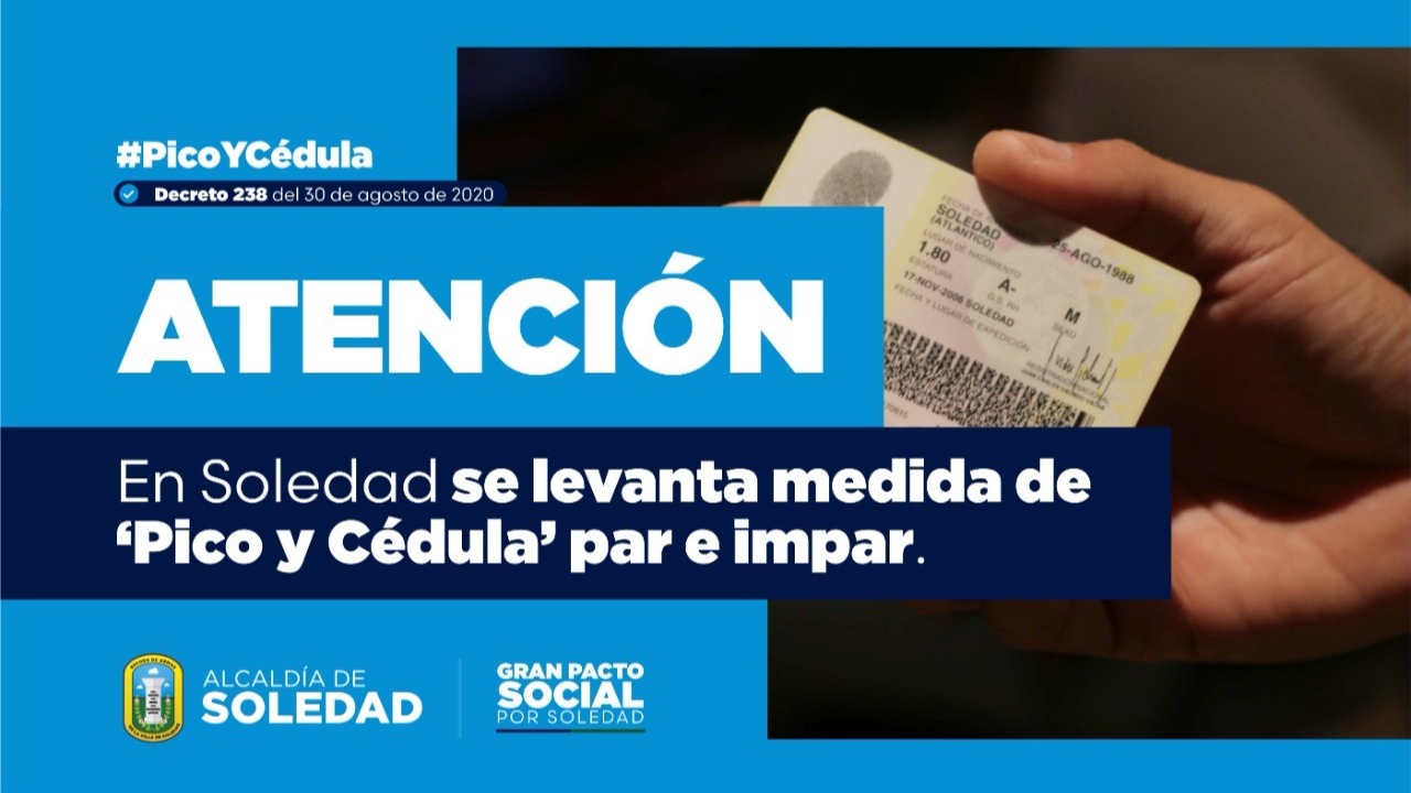 A partir de este 15 de septiembre se levanta la medida de ’Pico y Cédula’ par e impar en el municipio de Soledad, en cumplimiento del Decreto número 238 del 30 de agosto de 2020, ordenado por el alcalde municipal de Soledad, Rodolfo Ucrós Rosales.